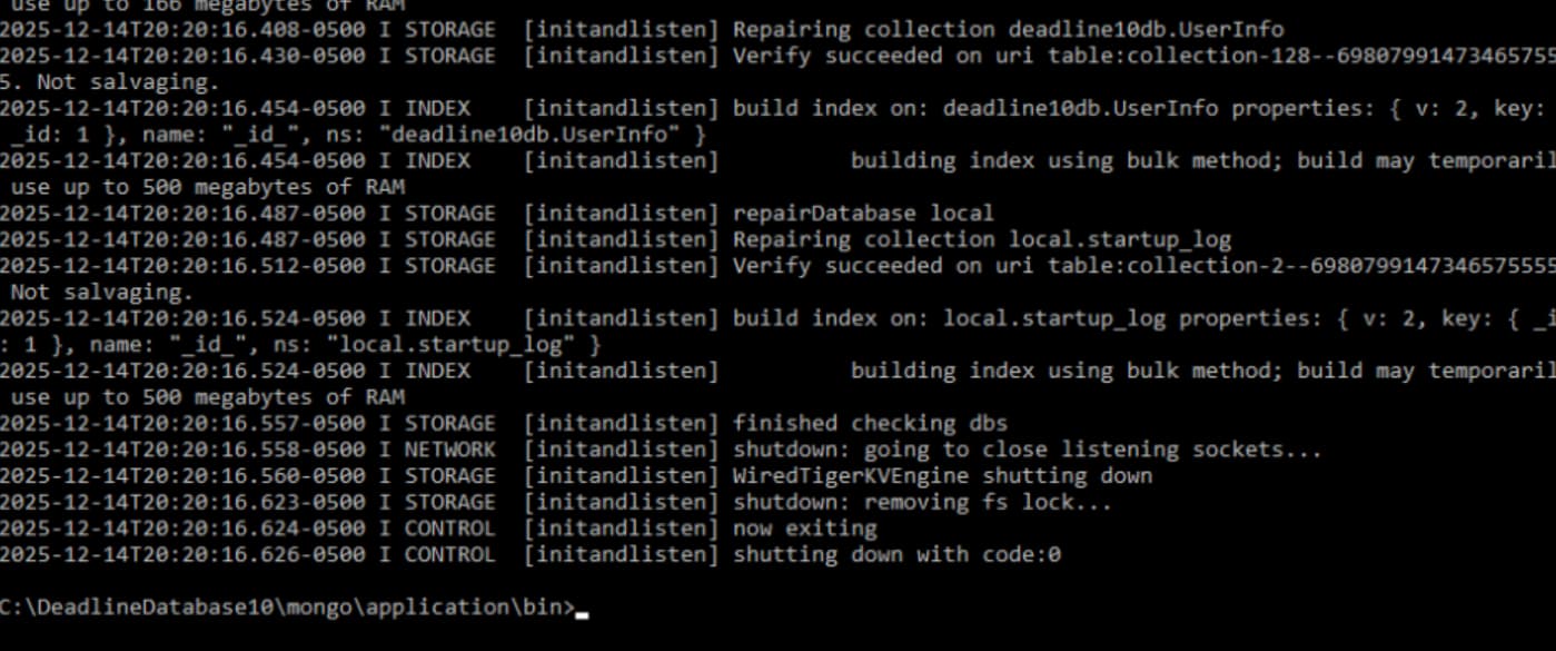 From Gemini: “If you see an error about mongod.lock, the repair tool usually fixes this automatically. If it fails specifically saying the lock file is the issue, you may need to go into your data folder and manually delete the file named mongod.lock.”
