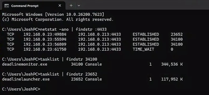 I’ve done several netstat commands on machines on port “4433” (assuming this is the default port) to see if there’s anything there causing it, and there’s only ever Deadline exe’s running. Is this what could be causing the issue? (Below is a reference to my workstation’s results)